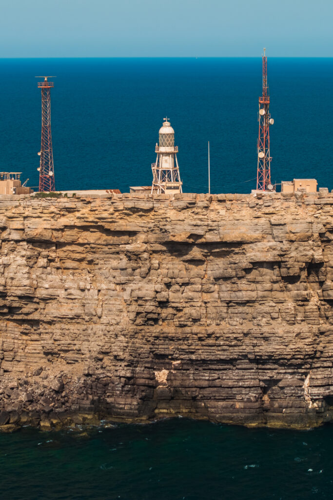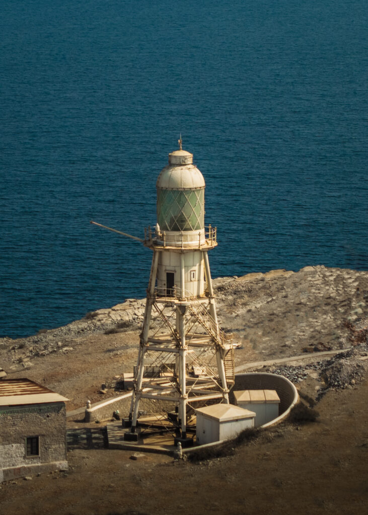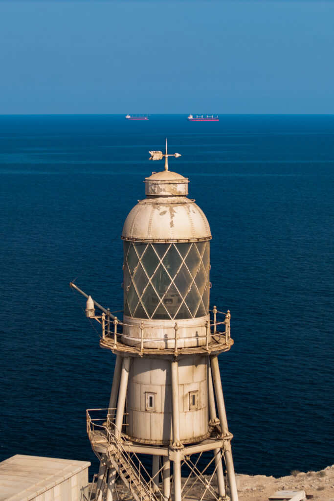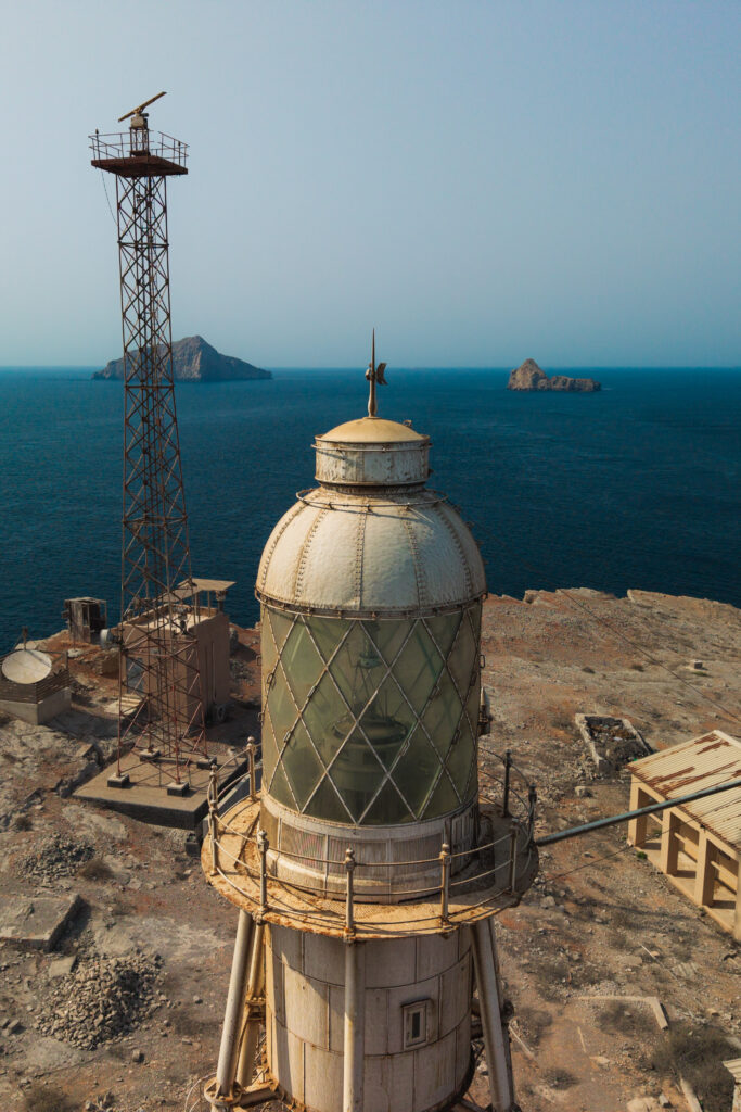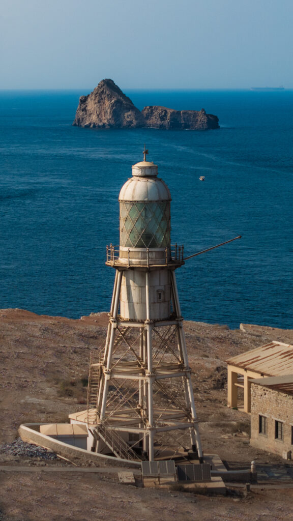 Didmar Lighthouse, constructed in 1914 by the British, is recognized as the oldest lighthouse in Oman. Built during a period of imperial maritime expansion in the Arabian Gulf, it holds significant heritage value. Its location on Didmar Island in the Strait of Hormuz highlights its strategic role as a navigational aid for one of the world’s most critical shipping routes. Architecturally, the lighthouse consists of a 24-meter hexagonal pyramidal skeletal tower with a lantern and gallery. It was originally equipped with a 2nd-order revolving lens manufactured by Chance Brothers of England, reflecting the influence of British engineering on early 20th-century lighthouse design.