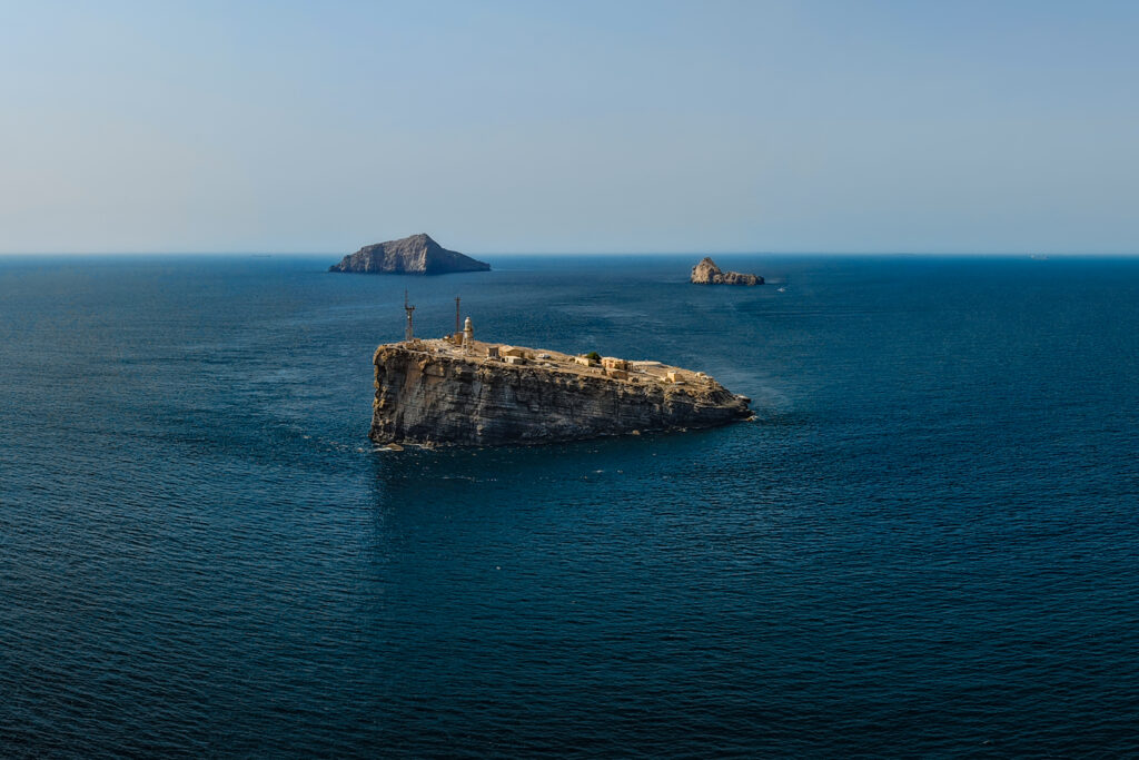Didmar Lighthouse is a 24-meter-high hexagonal pyramidal skeletal tower painted white, with a lantern, gallery, and enclosed watch room. It exhibits two white flashes every 10 seconds (Fl (2) W 10s) with a range of 23 nautical miles. The lighthouse was established in 1914 as the first lighthouse in Oman, built by the British on Didmar Island in the strategic Strait of Hormuz. The decision to build it was made in 1909 by the Committee of Enquiry on Lighting and Buoying the Gulf. Initially lit by kerosene with a clockwork mechanism, it featured a 2nd order revolving lens manufactured by Chance Brothers in 1913. The lighthouse guides ships through the Strait of Hormuz, a vital route where 25% of the world’s oil passes.