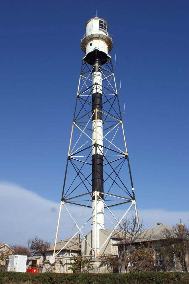 Tuzla Lighthouse is the oldest active lighthouse on the Romanian coast, constructed in 1900 by the French company Barbier, Bernard et Turenne. Located on Cape Tuzla, overlooking the Black Sea, the 44-meter-high cast iron skeletal tower features black and white horizontal bands and originally used oil lamps before being electrified in 1958. It was upgraded in 1946, 1957, and 1972. The lighthouse emits two white flashes every 9.7 seconds, visible up to 20 nautical miles, and includes an auxiliary red light and a fog signal. Built during the reign of King Carol I, it has played a crucial role in maritime safety, marking dangerous shallow waters along the coast.